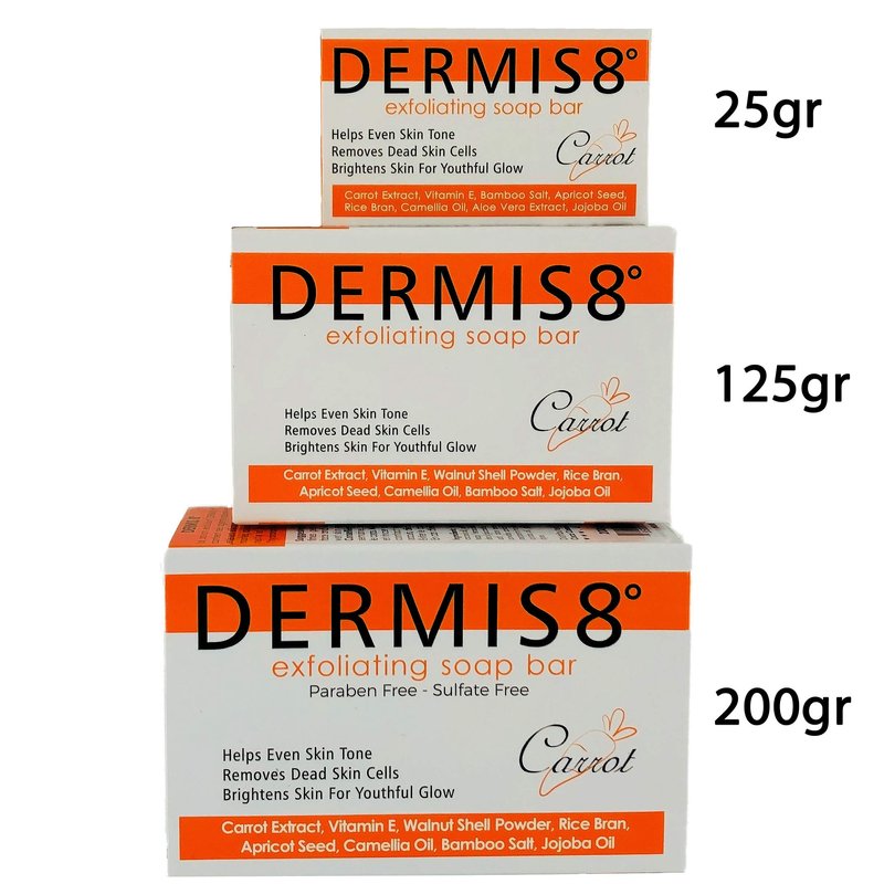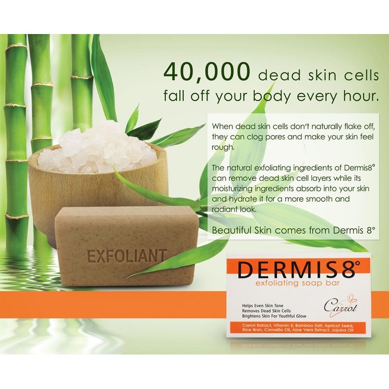 Dermis8 Exfoliating Soap for Face and Body contains 8 natural ingredients to help even out skin tone and leave your skin with a brighter, smoother finish. A luxurious way to shed the rough dead skin cells and uncover the radiant glow of youth. Our soaps are 100% authentic and made of quality ingredients.