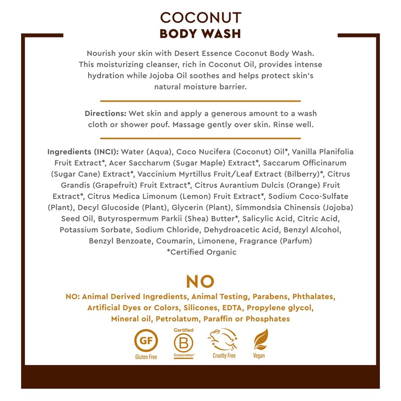Nourish your skin with Desert Essence Coconut Body Wash. This moisturizing cleanser, rich in Coconut Oil, provides intense hydration while Jojoba Oil soothes and helps protect skin’s natural moisture barrier.