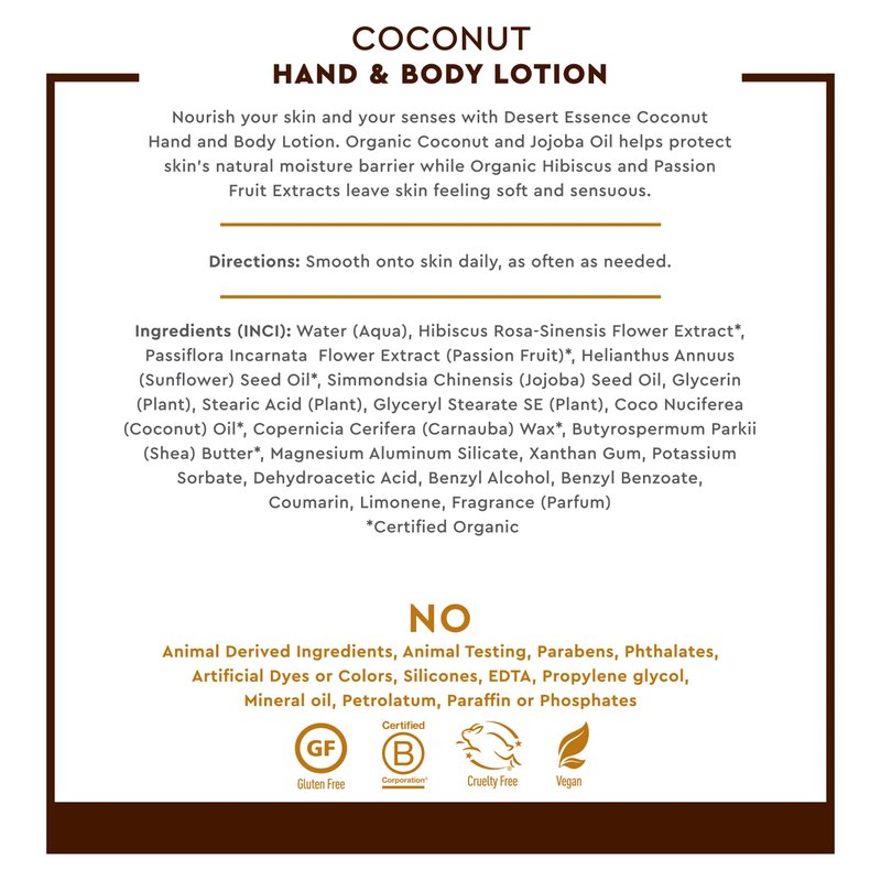 Nourish your skin and delight your senses with Desert Essence Coconut Hand and Body Lotion. Organic Coconut and Jojoba Oil helps protect skin’s natural moisture barrier while Organic Hibiscus and Passion Fruit Extract leaves skin feeling soft and sensuous.