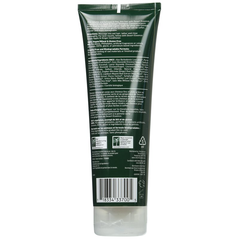 - ADDS SHINE - Desert Essence green apple and ginger shampoo has organic maca root that helps in thickening the hair and organic apple that adds the shine.
