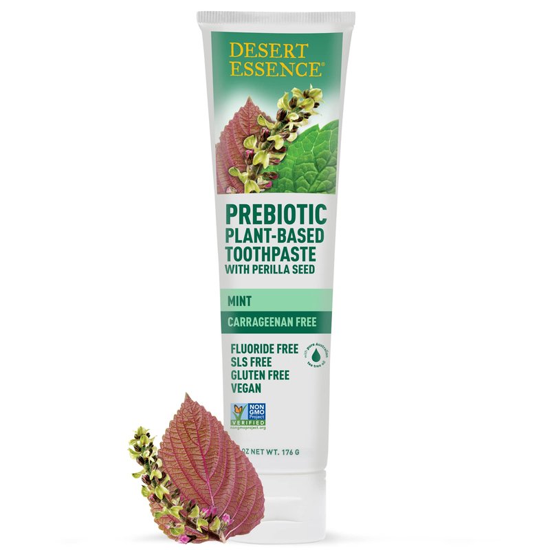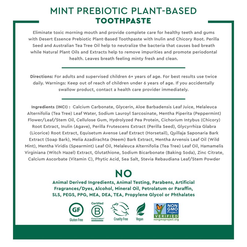 Desert Essence Prebiotic Plant-Based Toothpaste Mint 6.25 oz - Fluoride Free, No SLS, Gluten-Free, Vegan, Cruelty Free - Healthy Oral Microbiome - Tea Tree Oil, Inulin & Chicory Root