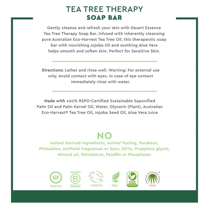 - THERAPEUTIC - This natural & vegetable-based cleansing bar is refreshingly therapeutic with antiseptic tea tree oil and moisture-enriched jojoba oil.