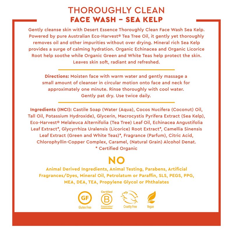 Desert Essence Thoroughly Clean Face Wash with Sea Kelp, Tea Tree Oil, Nourishing Castile Soap, Coconut Oil & More - Gently Remove Dirt & Impurities Without Drying Skin - Vegan, Sulfate Free - 8.5oz