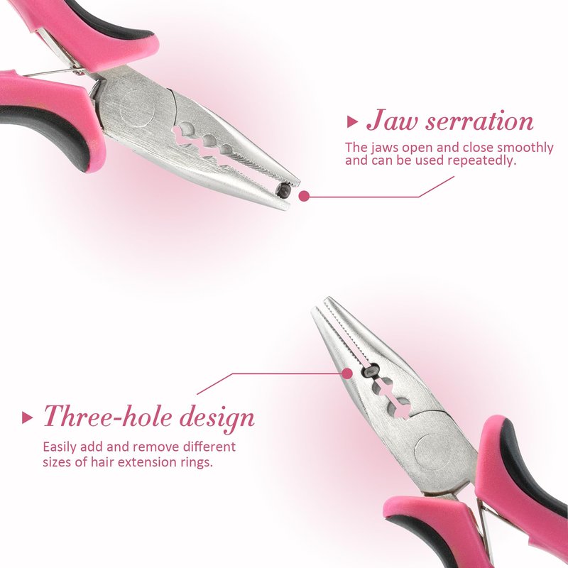 - This hair extension pliers adopts three-hole design, can easily add and remove different sizes of hair extension rings. Easy to operate and accurate.