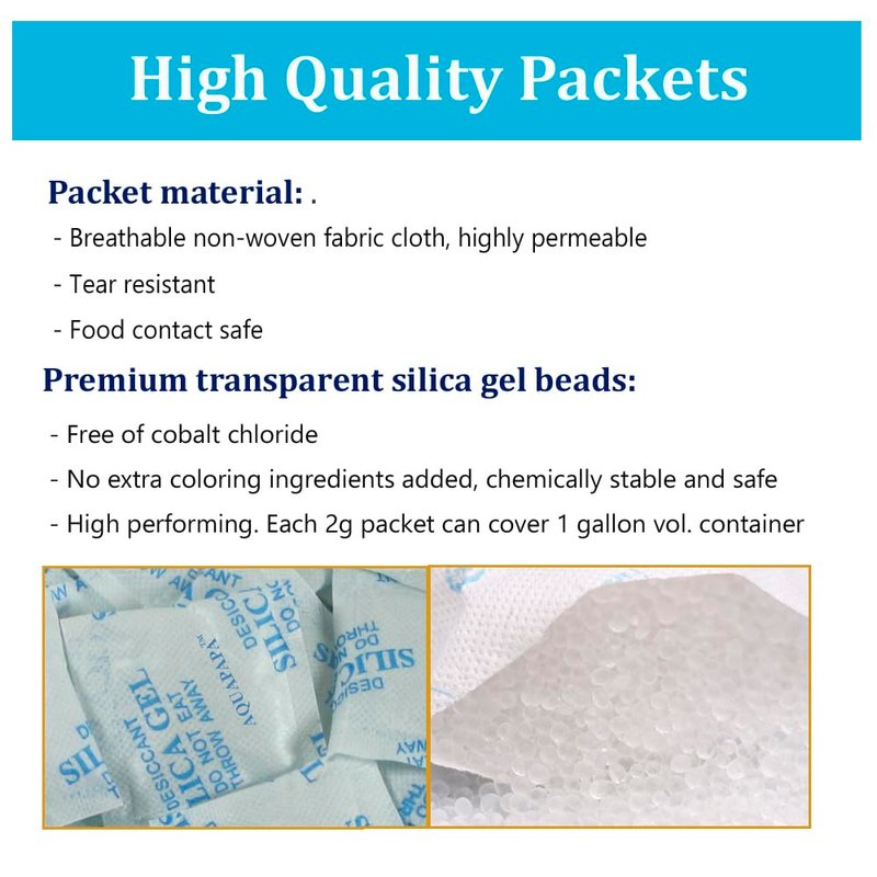 - Package includes: 100 desiccant packets. 2 gram each packet. Packet dimensions: 1.75" x 1.3" (inch).