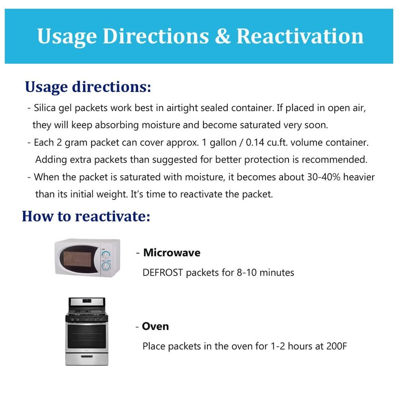 - USAGE DIRECTIONS: Each 2 gram packet can cover approx.1 gallon/ 0.14 cu.ft. volume container. We recommend adding extra packets than suggested for better protection. Put your items and these premium silica gel packets in a sealed container to protect your items from moisture damage. Use premium silica gel packets to protect your important documents, collectibles, books, valuable computers, electronics, camera lens, jewelry, photo album, leather items, shoes, silver, guns, ammos, etc