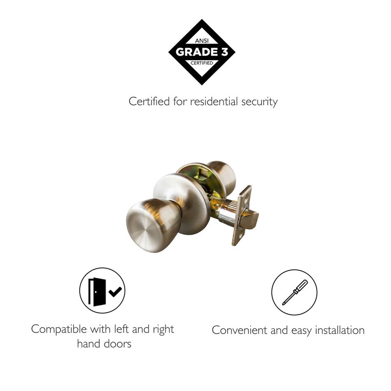 - DOOR KNOBS INTERIOR BRUSHED SATIN NICKEL- (Adjusts for 2-3/4-inch and 2-3/8-inch backsets) - (ANSI Grade-3 Certified) - (5-Year limited mechanical / 5-Year limited finish warranty).