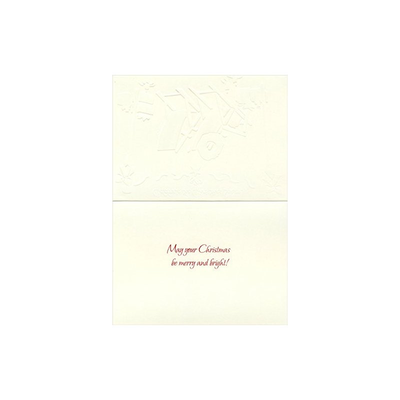 The interior of this Designer Greetings Christmas card design reads: May your Christmas be merry and bright! Each card measures 7x5 inches and is printed on heavy cardstock. The set includes 18 cards and 18 envelopes. The cards have the following special features: embossed.