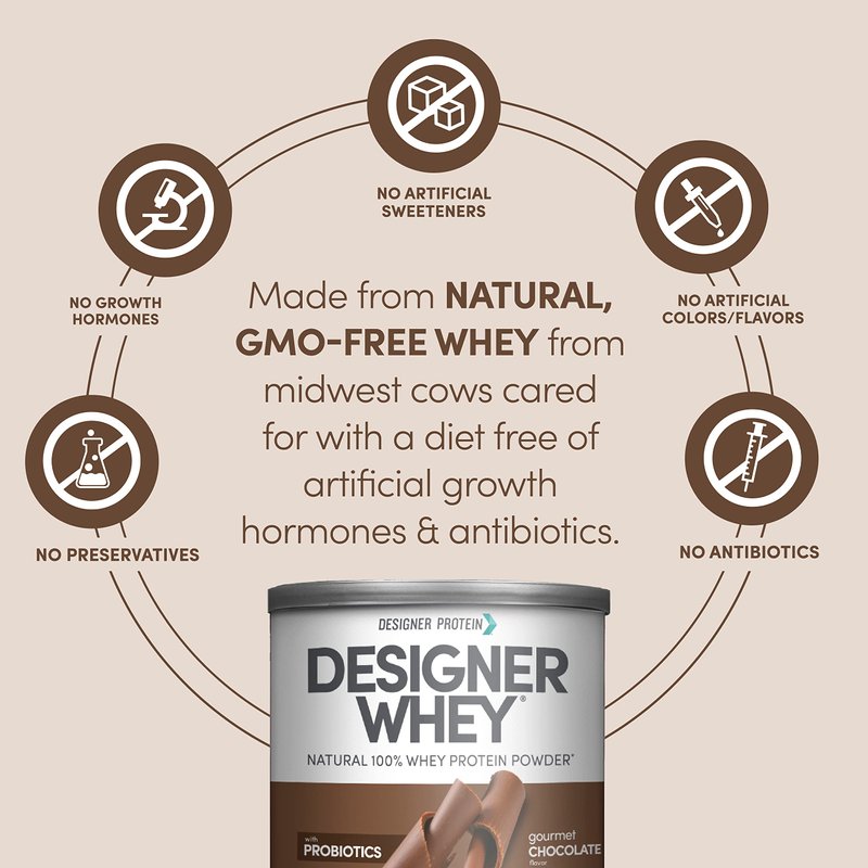 - Contains 1 - 12 Ounce canister of designer Whey protein powder by Designer Protein, Gourmet Chocolate flavor. Packaging May Vary