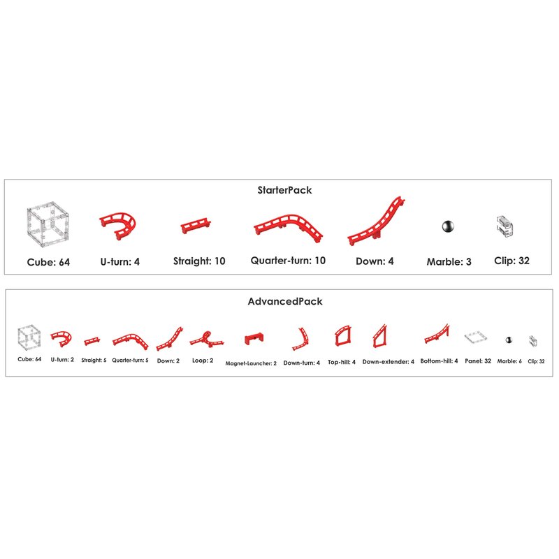 - 127 ASSORTED PIECES: 64x MagnetCubes, 32x Clip, 4x U-turn, 10x Straight, 10x Quarter-turn, 4x Down, 3x Marble.