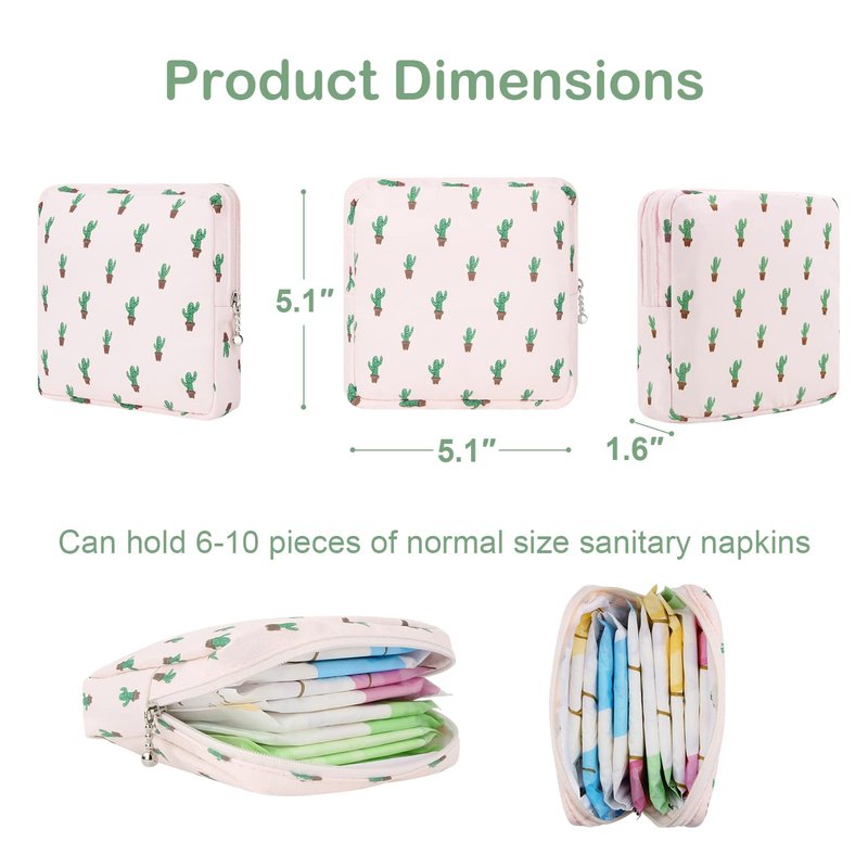 - 💕 【Meet Your Day's Needs】- Having a compact size: 5.1 x 5.1 x 1.6 inches, the pad storage bag can hold 6-10 pieces of normal size sanitary napkins. The inner pocket inside the pad pouch is easy to store small size tampons to keep them clean and orderly. Easily put the sanitary pads pouch in your backpack or handbag.
