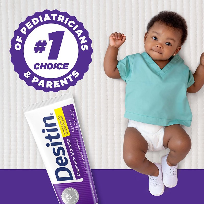 - 4.8-ounce tube of Desitin Maximum Strength Diaper Rash Paste with 40% zinc oxide works on contact to treat and prevent diaper rash discomfort