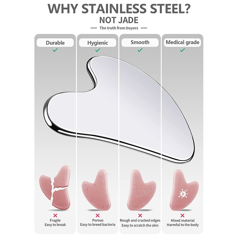 - STURDY & DURABLE: The traditional gua sha stone can easily shatter when dropped, but these stainless steel gua sha tools will endure forever. The Stainless Steel is long lasting no need to worry about falling. Heavier weight also will help get better gua sha results. It's definitely an upgrade to the traditional gua sha stone.