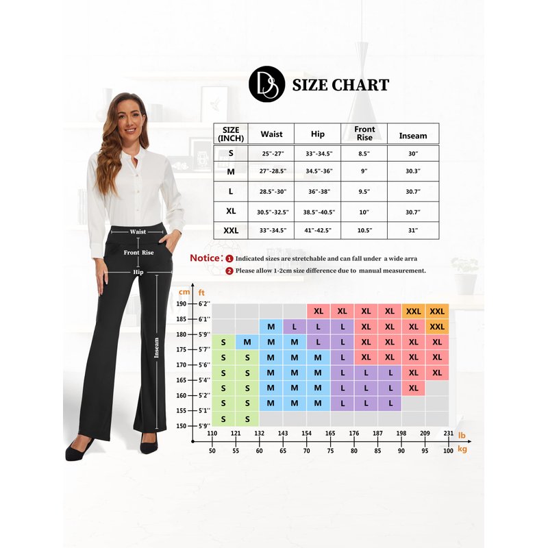 - 【High Waist & DIY Pants】Featuring a boot cut leg, our high waist work pants flatter every body type.High-rise and wide waistband can contour your curves and streamlines your shape perfectly. The classic style is elevated to modern standard with a tighter fit through the leg.If the original size does not fit your body, all you need is a little "DIY", simply cut off the extra part to tailor your inseam length.After that, there is no need to hem the edges. It can all be done by DO IT YOURSELF!