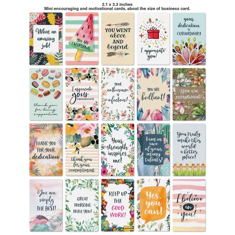 - 63 DIFFERENT ENCOURAGING MINI MOTIVATIONAL CARDS TO BRIGHTEN SOMEONE'S DAY: These beautiful business card sized motivational cards (approx 2x3.5 inches) feature 63 unique encouraging messages and designs that are easy to read and uplifting - there are no repeated cards! Use as a simple yet great way to spread some positivity and kindness whenever you or others are in need of a pick-me-up!