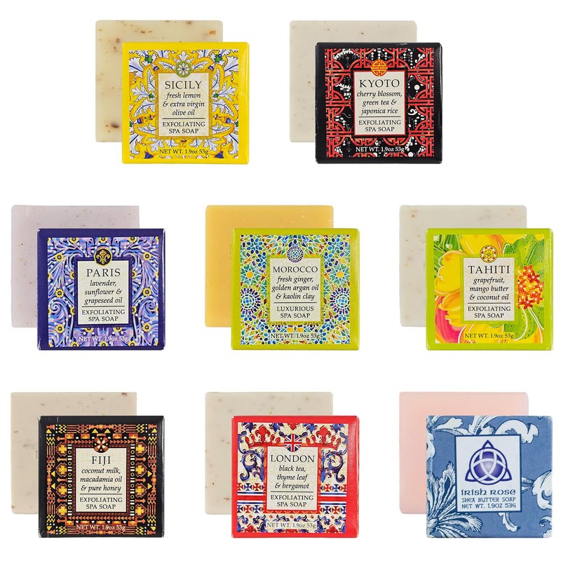 Destination Soap Sampler- Set of 8 Exfoliating Spa Soap Bars- Enriched with Shea Butter and Essential Oils- Sicily, Kyoto, London, Paris, Morocco, Tahiti, Fiji and Custom Soap- Party Favors for AdultsHave the desire to travel the world? Take your senses on a mini vacation with our luxurious spa soaps. Each 1.9 oz soap bar is inspired by popular travel destinations from around the globe. This spa collection includes eight botanical scents: Kyoto, London, Morocco, Tahiti, Paris, Sicily, Fiji and our CUSTOM rose scented soap.Kyoto is enriched with shea butter, cocoa butter, sesame oil and blended with exfoliating green tea leaves & japonica rice flour. London is enriched with shea butter, cocoa butter, coconut milk, macadamia nut oil, pure honey and blended with exfoliating coconut husk. Morocco is enriched with shea butter, cocoa butter, fresh ginger, golden argan oil and white kaolin clay. Tahiti is enriched with shea butter, cocoa butter, mango butter, coconut oil and blended with exfoliating grapefruit extracts. Paris is enriched with shea butter, cocoa butter, lavender, sunflower oil, grapeseed and blended with exfoliating lavender buds. Sicily is enriched with shea butter, cocoa butter, lemon extracts, extra virgin olive oil and blended with lemon peel. Fiji is enriched with shea butter, cocoa butter, coconut milk, macadamia nut oil, pure honey and blended with exfoliating coconut husk. Our custom irish rose scent is enriched with shea butter, cocoa butter, rose and jasmine oil.This gender neutral eco-friendly soap set is ideal for birthdays, anniversaries, party favors, housewarmings, teacher appreciation, Christmas, Easter, white elephant, weddings and hotel rooms, and guest bathrooms.For External Use ONLY