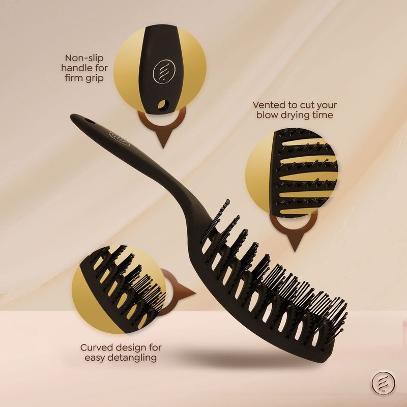 - C URVED HA IR BRUSH FOR EFFORTLESS, ANTI - BREAKAGE DETANGLING: The innovative shape of our curved brush glides effortlessly through your hair to get rid even of the most stubborn knots and clumps without pulling or damag ing your hair. Its large, contoured surface also brushes more hair at once for faster, painless and smoother brushing!