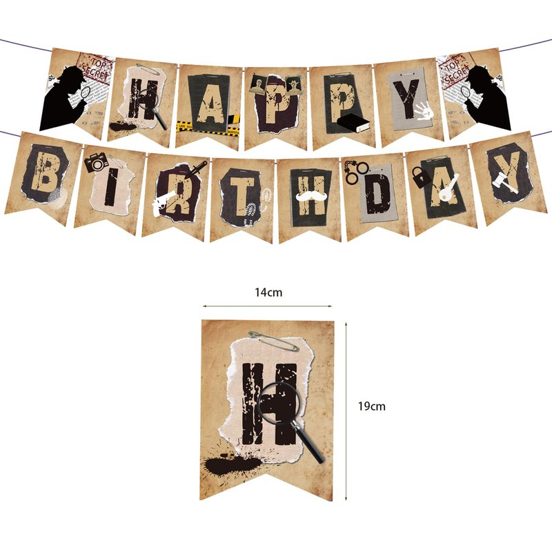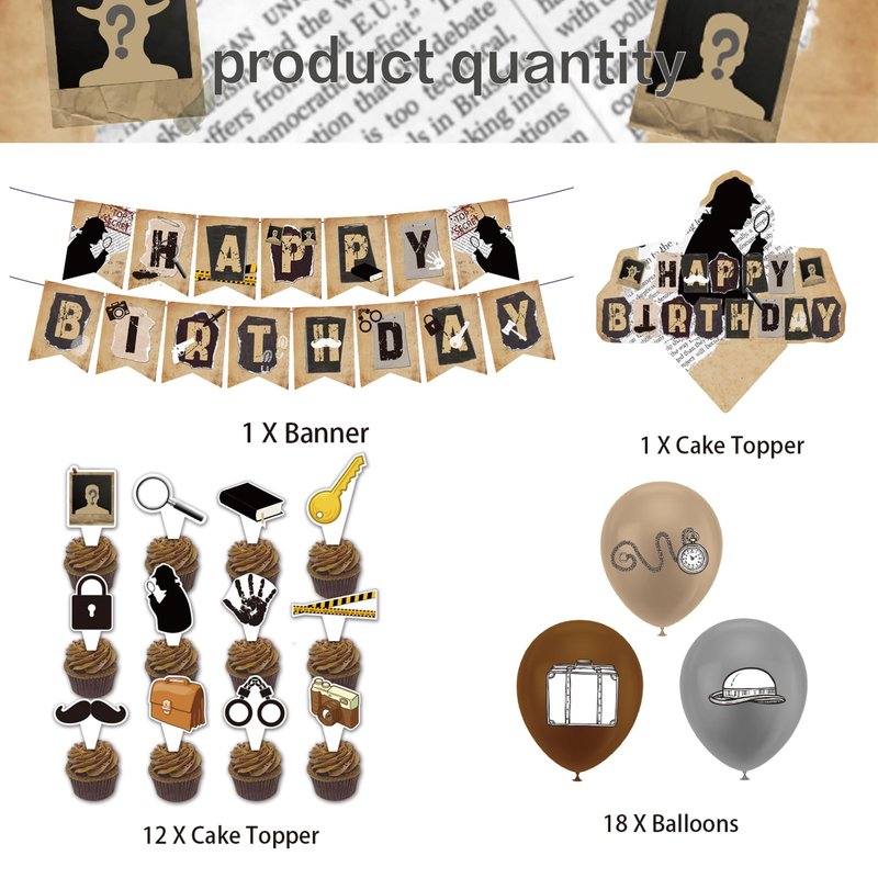- Detective Party Supplies: Package includes 1 * detective HAPPY BIRTHDAY banner, 1 * detective HAPPY BIRTHDAY cake topper, 12 * detective cupcake toppers, 18* detective balloons, 1 ribbon. Perfect for detective themed parties, mystery parties.
