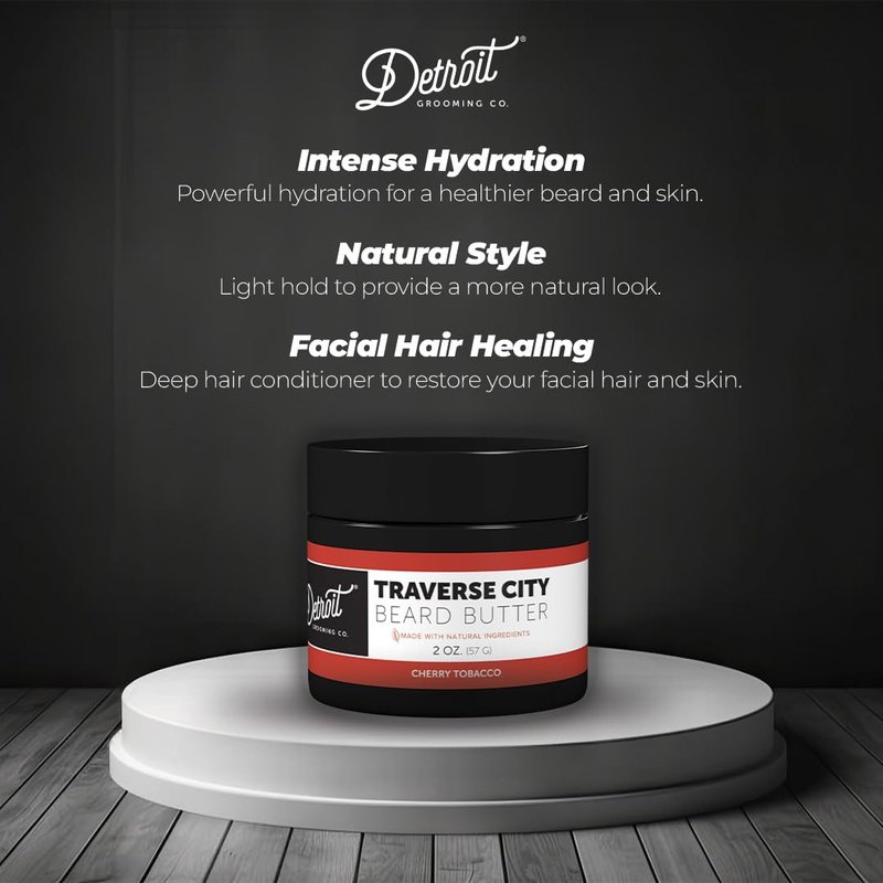 Introducing Detroit Grooming Co. Beard Butter, the ultimate solution for your beard care needs. Our all-natural beard butter for men provides intensive moisturization and hydration to both your beard and skin. With nourishing ingredients like Shea Moisture and essential oils, this deep hair conditioner promotes a healthier beard and skin. Experience the benefits of hydration as your beard becomes softer and more manageable.Our beard butter not only hydrates but also offers a light hold for a natural and styled look. Effortlessly tame and groom your beard for a well-maintained appearance. Say goodbye to dry, coarse facial hair and skin – our deep conditioning beard butter helps restore and heal, leaving you refreshed and rejuvenated.Detroit Grooming Co. Beard Butter is the go-to choice for beard care enthusiasts. Our carefully formulated balm is perfect for intensive moisturization and natural styling. Treat yourself to healthier, softer facial hair and enjoy the confidence of a well-groomed appearance.Choose Detroit Grooming Co. Beard Butter for a deeply hydrated beard and skin, a well-styled and tamed beard, and an easy-to-groom routine. Trust the brand known for exceptional beard care products. Take your beard care to the next level and enjoy the results of a nourished and well-maintained beard.