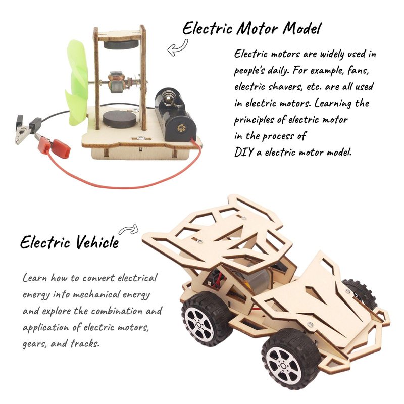 - Project B - Electric Motor Model : This project kit contains all the parts to build a model electric motor. Through this STEM experiment, you can learn about the structure of an electric motor. Learn practical application case of converting electrical energy into mechanical energy.