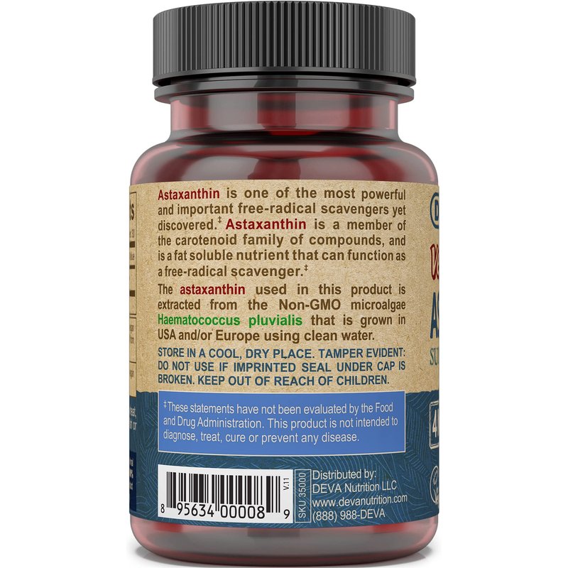 Deva Nutrition Vitamins Astaxanthin 4mg, Vegan, Made from Haematococcus Pluvialis Microalgae, 30 Capsules, 1-Pack