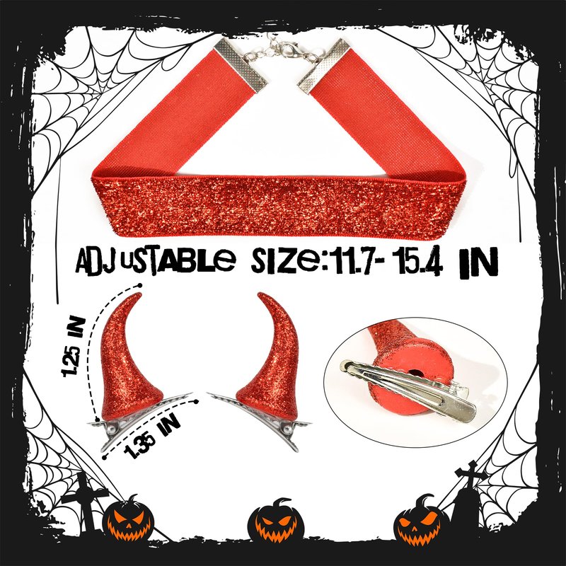 - Devil Costume Accessories: The package includes 1 pair of glitter red devil horn hair clips and 1 red choker necklace. Perfect devil costume accessories for women and men, these devil horns can be used with any outfit to add an element of personality and create a joyful holiday atmosphere
