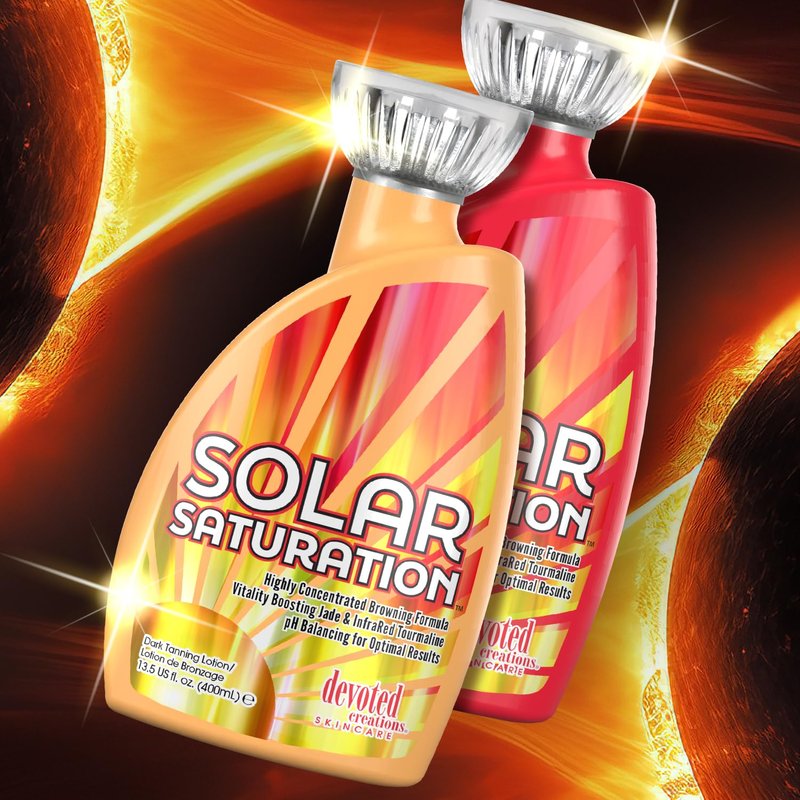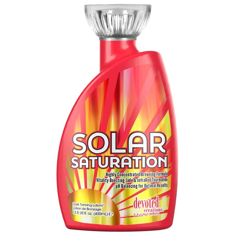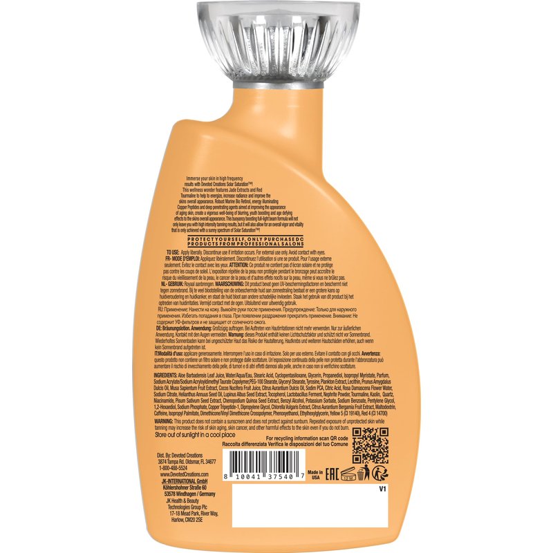 Immerse your skin in high frequency results with Devoted Creations Solar Saturation! This wellness wonder features Jade Extracts and Red Tourmaline to help to energize, increase radiance and improve the skins overall appearance. Robust Marine Bio Retinol, energy illuminating Copper Peptides and deep penetrating agents aimed at improving the appearance of aging skin, create a vigorous well-being of blurring, youth boosting and age defying effects to the skins overall appearance. This buoyancy boosting full-light beam formula will not only leave you with high intensity tanning results, but it will also allow for an overall vigor and vitality that is only achieved with a sunny spectrum of Solar Saturation!