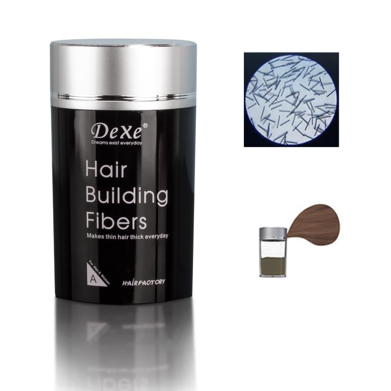 Dexe HAIR BUILDING FIBERS is used to improve any area of sparse hair. It thickens hair to reach the look you want. With it's easy use you can have great looking hair instantly. Dexe HAIR BUILDING FIBERS are not only convenient, but cost-effective. Dexe HAIR BUILDING FIBERS last through rain, wind and even sports! Dexe's hair loss treatment system for everyday use will enhance your thinning hair so you can look as young as you feel. Dexe hair building fibers is an amazing , and natural product that instantly eliminates the appearance of thin hair for both men and women. It is a finely textured natural substance that binds to your existing hair and forms a complete layer of "hair" above your scalp on where your natural hair is. Usage Step : Step1: Apply Hair Building Fibers Over Thinning Areas *Remove the cap and position bottle over your head,holding it at a 45-degree angle. *Gently tap the fibers over your hair until the thinning areas are no longer visible and you are satisfied with the fullness and volume of your hair. Step2: Pat The Hair Building Fibers Into Your Hair *Gently pat the fiber to blend them into your natural hir. *Doing this will make the Hair Building Fibers completely undetectable.