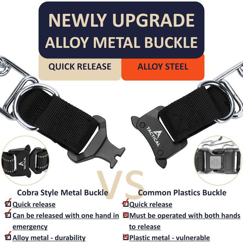 - 【Buckle Upgrade】-- This training collar buckles use high-strength metal quick release buckles (Usually used for tactical belts). Easy to put on and off without the need to take links apart. The metal material has a long life, easy for closed and prevent accidental unfastening. In an emergency, you only need to use two fingers to press at the same time to release.