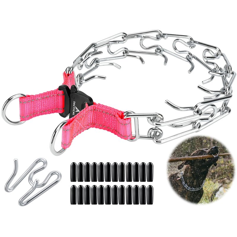 The DEYACE Dog Prong Collar is a safer and effectiver training collar, it puts even pressure around the neck. This pinch collar does not apply direct pressure to the trachea, so you can train a dog with little or no tugging, jerking, or pulling. Made of high quality stainless steel and tactical buckle, the size of this collar can be adjusted by adding or removing the links individually.