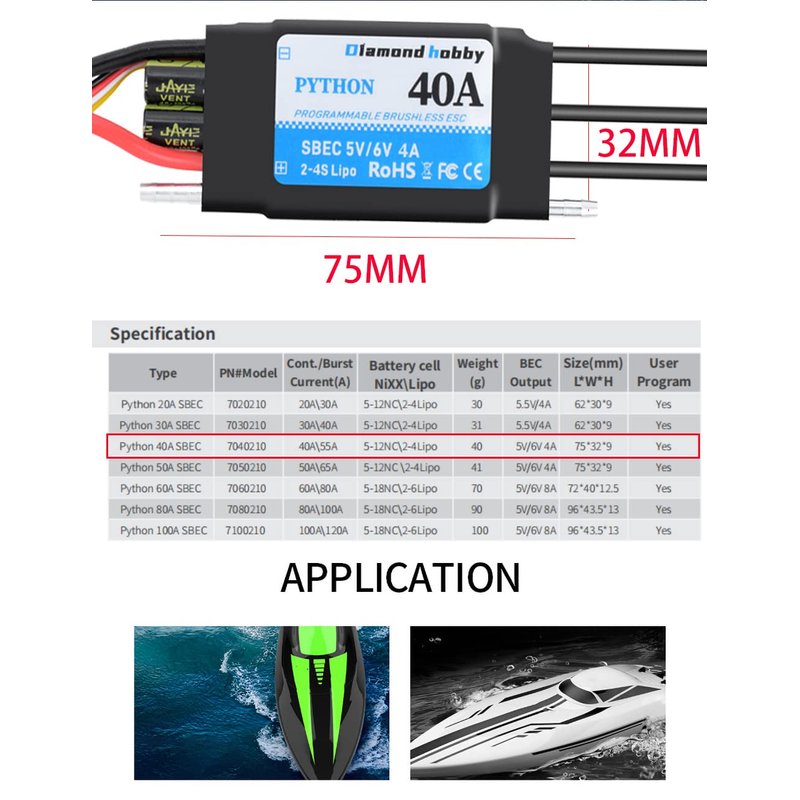 - The ESC is waterproof and glued, and the flat water-cooling design ensures efficient heat dissipation. Super smooth start- up and accurate throttle linearity make the ESC suitable for all kinds of RC boat models.