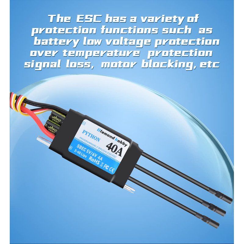 - Adjustable SBEC 5V/6V output voltage provides more powerful power to the servo. Multiple protections: start-up, over-heat, low-voltage cutoff, signal loss, phase loss.