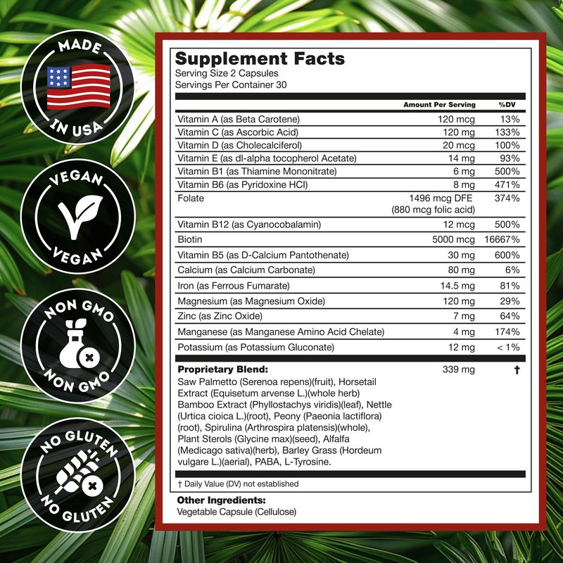 - 3 In 1: Make Your Nails & Skin Healthier Too - Carefully chosen ingredients mixed in amazing blend with Saw Palmetto, Spirulina, Biotin, Zinc, Mineral Complex and Vitamins will make your nails and skin healthier. Biotin also helps to keep your eyes, liver, and nervous system healthy. With just 1 product you can bring your overall health to the next level.