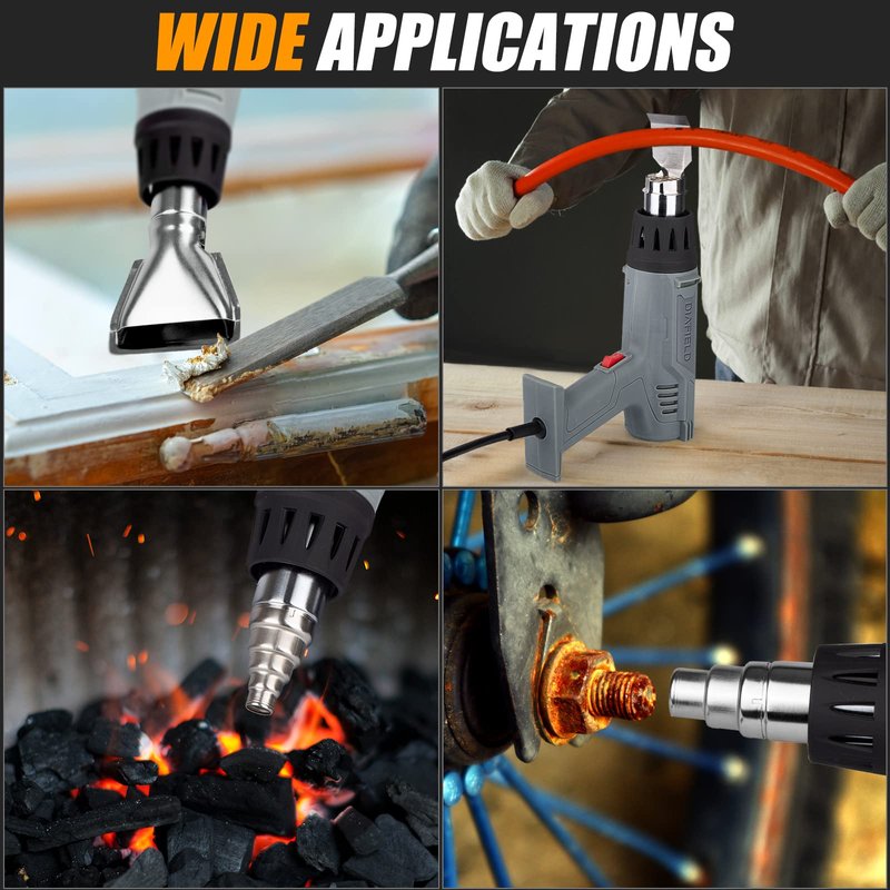 - [Wide Variety of Applications] 4 nozzle attachments are included to meet many different application needs. Ideal use for shrink wrapping, epoxy resin, shrink tubing, crafts, cell phone repairs, vinyl wrap, paint removal, electronics repair, and so much more