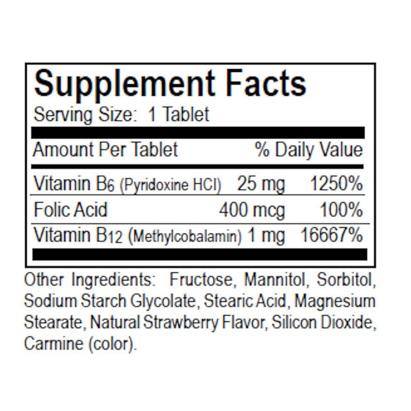 Each pleasant tasting strawberry flavored Vitamin B12 Plus tablet contains 1 mg of Vitamin B12 (as Methylcobalamin), 25 mg of B6 and 400 mcg of Folic Acid. These are nutrients that help maintain cardiovascular health.* Methylcobalamin, the active form of Cobalamin in the body, requires no previous conversion, as the Cyancobalamin form does. * The benefit of the Methylcobalamin form is that it is utilized more efficiently by the body.* *These statements have not been evaluated by the Food and Drug Administration. This product is not intended to diagnos, treat, cure or prevent any disease. Hillestad Pharmaceuticals: Making quality products since 1959!