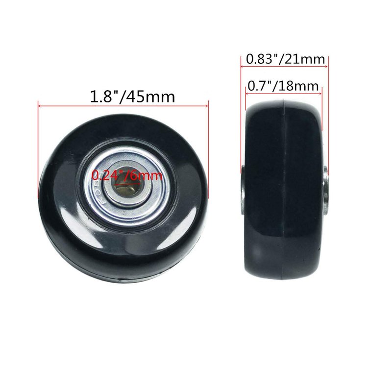 - Wheel size: diameter is 1.8in (45mm), width is 0.7in (18mm), Bearing width is 0.83in (21mm), Center Bearing internal diameter is 6mm (see the wheel size label in the picture).