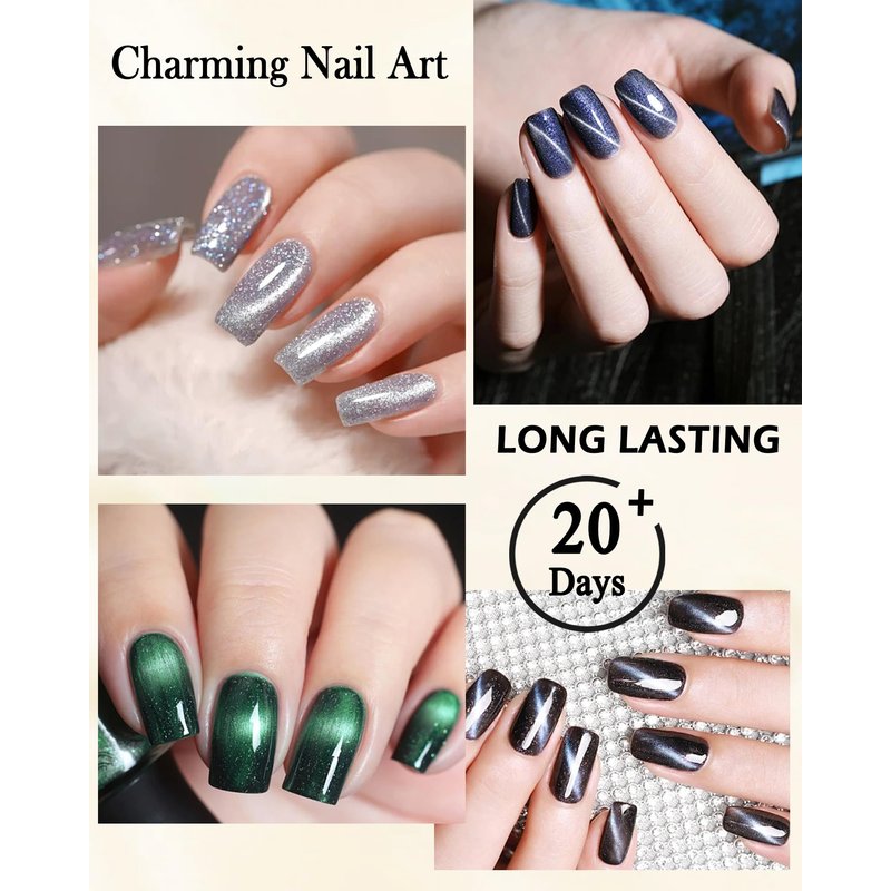 - LONG LASTING SHINY & HEALTHY - This diamond glitter cat eye polish with upgraded formula has long-lasting features, waterproof and stain-proof after curing, not easy to peel off, pure color, will not darken, long-lasting luster, can maintain a long time to maintain a high shining effect, long-lasting luster to make your nails more glittering and charming. At the same time, its ingredients are healthy and friendly and will not damage your nails.