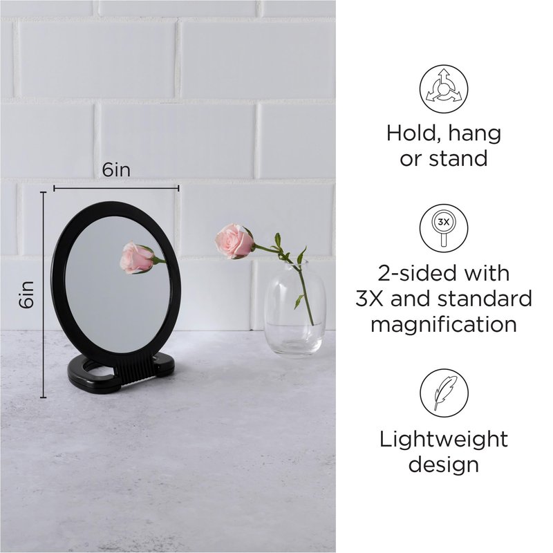- DOUBLE-SIDED: This handheld mirror with handle features 1X magnification on one side and 3X magnification on the other making it ideal for detail work like applying makeup, lashes, brow shaping, shaving and other personal grooming needs.