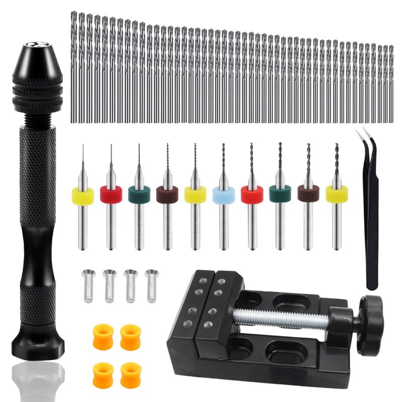 - Package: 1pcs Mini Drill Press Vise, 1pcs pin vise hand drill, 1cps elbow tweezers, 48pcs micro twist drill bits and 10pcs PCB mini drill bits, total 61pcs.