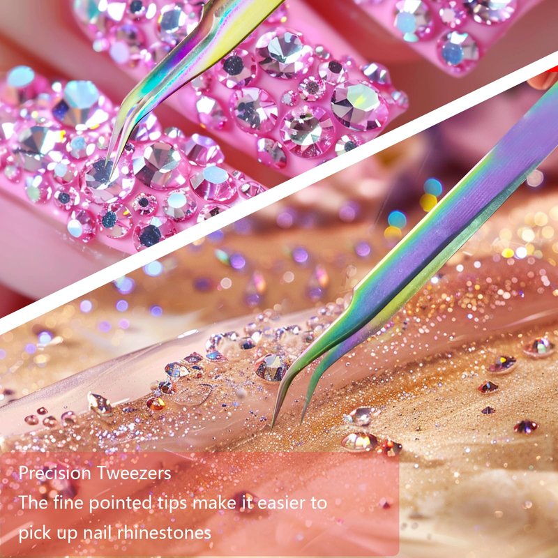 - Rhinestone Picker Tool: Suitable for pick up and place rhinestones onto your nail and costumes or crafts with this versatile gem pen tool. Includes 1 Storage bag, 3 rhinestone pickers,1 Rainbow titanium tweezers and 3 Extra wax tips The 1-centimeter diameter acrylic handle is comfortable to grip, resistant to deformation. The rainbow titanium of the tweezers is especially beautiful.
