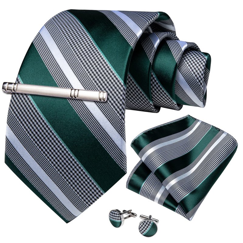 - đăPURCHASE CONTAINSăSilk Green Striped Necktie + Woven Pocket Square + Cufflinks + Silver Tie Clip+ Gift box.It's Proper gift for Father's Day,Christmas Day,Valentine's Day,Thanksgiving Day,Anniversary,birthday ect