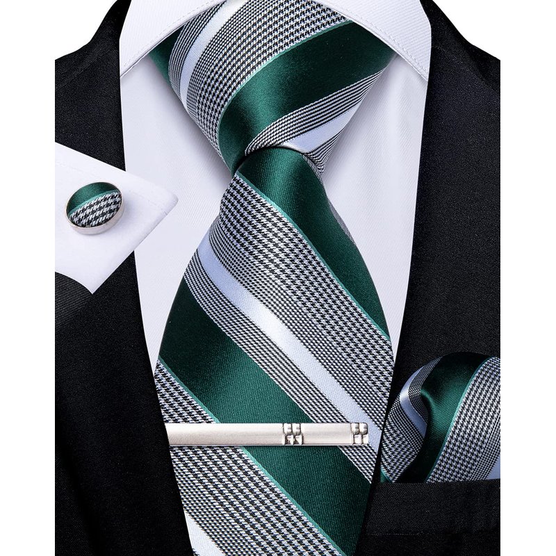 DiBanGu Men's Emerald Green Grey Striped Tie Silk Woven Necktie Pocket Square Cufflink Set Formal
