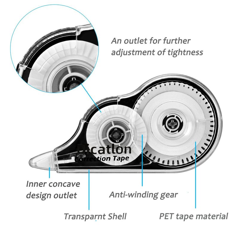 Dicatlon - Seek a positive and progressive life Our goal:Use good products to improve your quality of life! Our message:We will not hesitate to turn you into a happy customer. It consists of film tape Compared with other paper rolls on the market, ours are brighter and clearer. High tear resistance prevents accidental cracking and provides reliable high ease of use. Easy to use The tape in the Dicatlon correction tape has high brightness and opacity. The correction tape itself has no smell, so it is an ideal choice for students and office workers. Copying, scanning and faxing are not affected After use, the document can be copied as normal without any obvious traces of correction. Ideal for students, office workers or government employees. Quick dry material It can be rewritten instantly, including all your favorite pens, whether pens, neutral pens, ballpoint pens or pencils. The tape is made of transparent polyester All the details of the product are clearly visible. Large anti-winding coil. There is also a pre-arranged opening to adjust the tightness of the ribbon. This ensures functionality and usability. Standard 5mm bandwidth The curved unwinding head allows smooth application. The revised width is 5 mm, which is in line with today's writing paper standards. Always fully covered. Convenient and easy Dicatlon rectifying roller is ergonomically designed. Just hold it loosely in your hand and roll it off. In fact, not much effort. Exterior design You can always see how many correction strips are available thanks to our convenient transparent case of correction rollers. Each correction roll has a protective cap. Dicatlon office supplies and stationery: solve your daily discomfort in study and work. The high-quality and convenient error correction roller helps you quickly and reliably conceal writing errors. We can conscientiously put Dicatlon's error correction roller to let you use it with confidence.