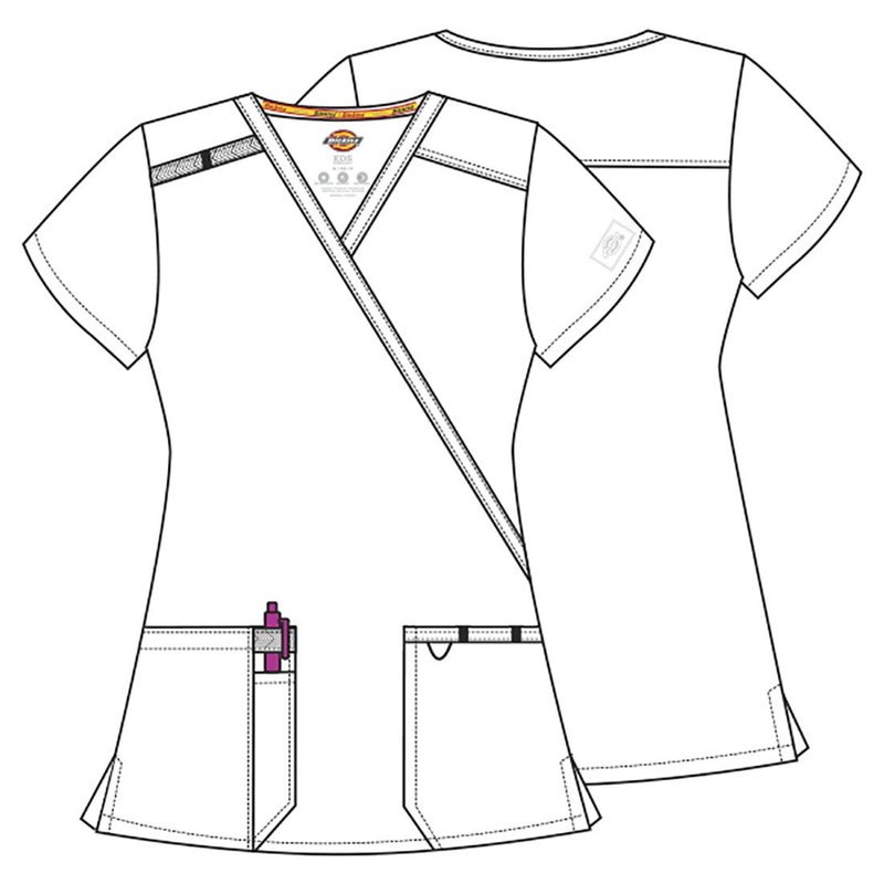Dickies EDS Essentials Womens Scrub Tops | Stylish Mock Wrap Top You work hard every day, so your clothing should work as hard as you do. Nursing scrubs for women enter a new era of reliable, durable and fashionable options with Dickies EDS Essentials. Soft performance fabric is paired with functional utility details for an updated look and feel you'll love. Light polyester/spandex fabric blend of four-way stretch poplin features moisture wicking. The easy care fabric drapes well with great color retention. This stylish mock wrap top features front shoulder yokes with matching twill tape instrument loops at the right shoulder plus a back yoke. These medical scrubs for women also have two roomy front patch pockets to store your stuff. Left pocket features instrument loops and bungee loop. Right pocket features instrument slot with matching twill tape. Pockets are large enough for iPhone and Galaxy phones. Side vents for ease of movement. Discrete tonal label on left sleeve. Heat transfer neck label for tagless comfort. Plus size scrubs for women available. For scrub tops women will love, shop the entire Dickies EDS Essentials collection. Dickies EDS Essentials: Making your everyday extraordinary in soft, affordable, essential scrubs. Contemporary fit. Moisture wicking finish moves moisture away from the body to keep you comfortable through a long work shift. 95% polyester / 5% spandex poplin Center back length (size S): 26"