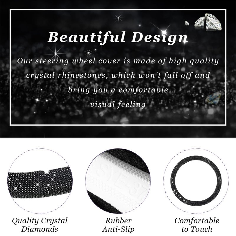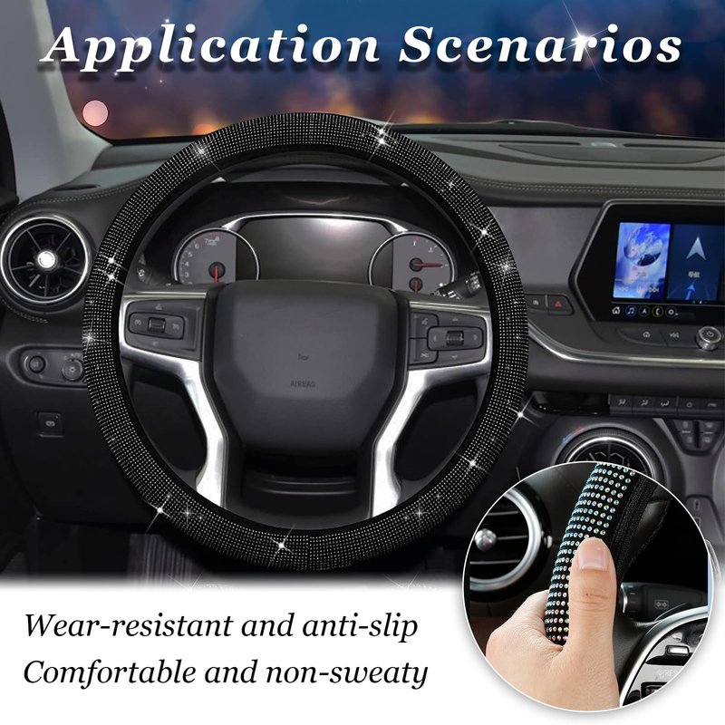 - 【High Quality Material】: This steering wheel cover features a luxurious black velvet outer layer, where each rhinestone is meticulously secured, guaranteeing they won't detach. Plus, the tight stitching enhances not only its durability but also provides exceptional elasticity for a snug, unbreakable fit.