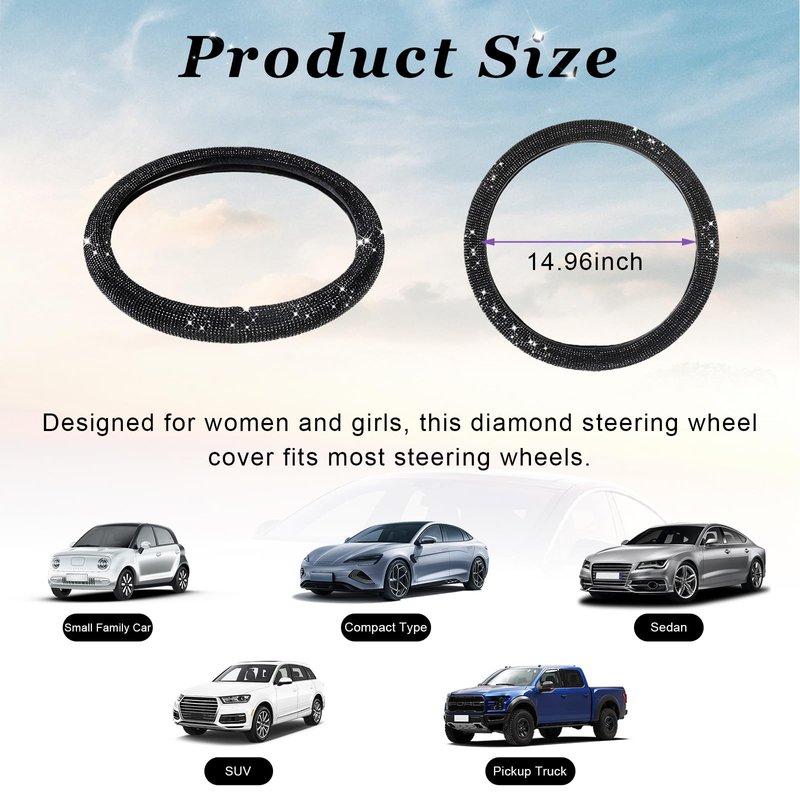 - 【Universal Fit】: This diamond steering wheel cover is designed for women and girls, and it is compatible with the standard size 14.96 inches diameter steering wheel, which is suitable for most car steering wheels. The perfect gift for women and girls, especially on special occasions such as Christmas and birthdays.