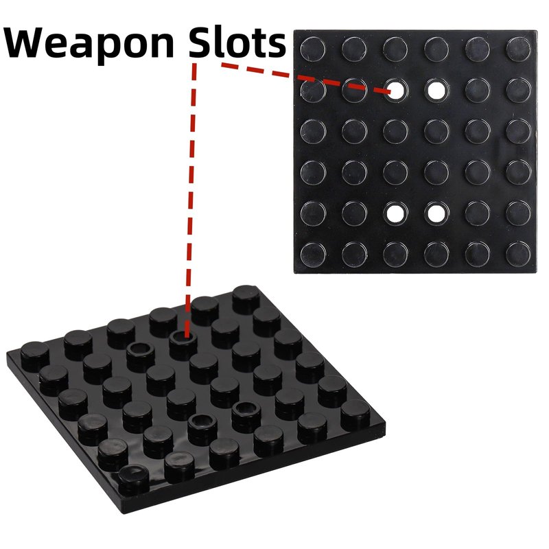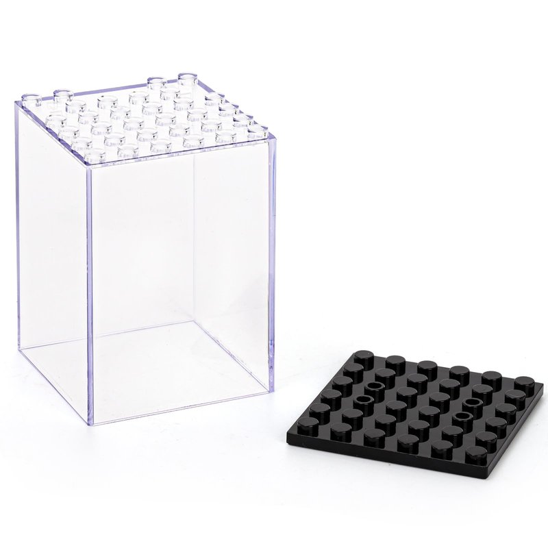 - Package: 20 pcs clear display cases. size: 1.7" L x 1.7" W x 2" H. Base plate is 6x6 cells, and 4 slots are configured, which can be used to place the figure's weapons. Nice for showcasing a single minifigure.