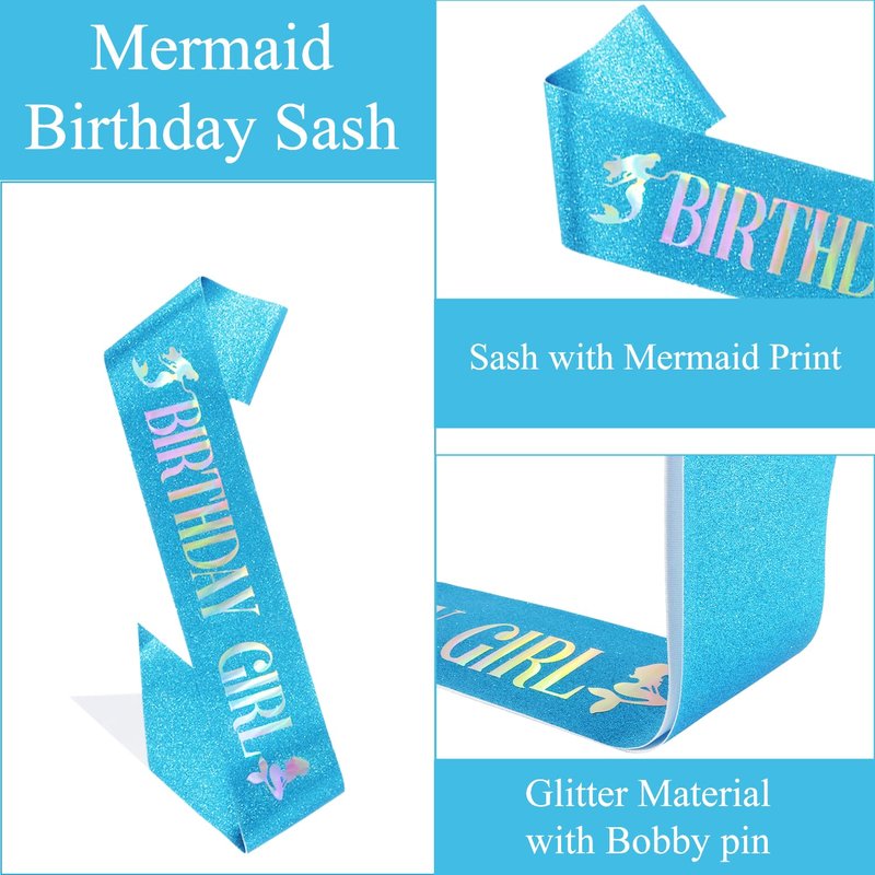 - 🧜♀️Glitter Mermaid Sash - The sparkling birthday girl sash with mermaid print is totally matching the ocean mermaid theme birthday party. A complimentary bobby pin comes along in the package to adjust the length of the sash.