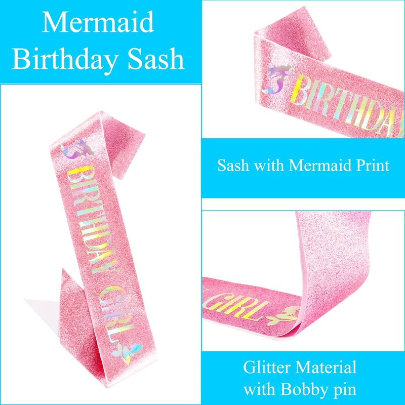 - 🧜♀️Glitter Mermaid Sash - The sparkling birthday girl sash with mermaid print is totally matching the ocean mermaid theme birthday party. A complimentary bobby pin comes along in the package to adjust the length of the sash.