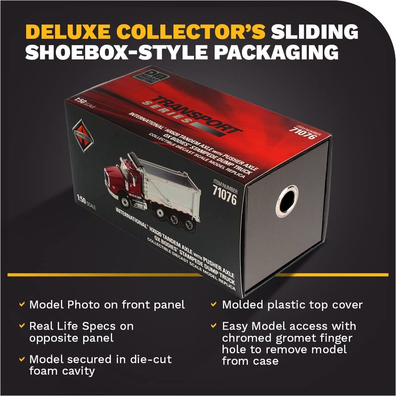 - PREMIUM COLLECTORS PACKAGING - This model comes in the premium Diecast Masters Deluxe Sliding Shoe-Box Transport Series packaging. The collectible packaging features a model photo on the front panel with real-life specs on the opposite panel. The replica model is held secure in a die-cut foam cavity with a molded plastic top cover. Easily access the truck model with the chromed grommet finger hole to slide it from the case.